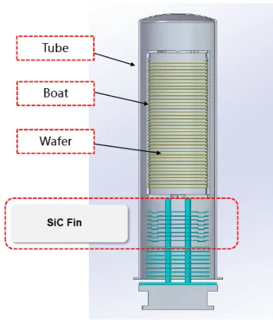 Семицорек солидребра од силицијум карбидасе обично инсталирају као компоненте топлотне изолације унутар вертикалних цеви пећи опреме за термичку обраду полупроводника, као што су РТП пећи за жарење и дифузионе пећи. Семицорек чврста ребра од силицијум карбида могу ефикасно регулисати дистрибуцију температуре у високотемпературним пећима и минимизирати топлотно оштећење делова заптивних врата процеса узроковано високим температурама. У условима влажне оксидације, Семицорек чврста ребра од силицијум карбида могу се користити за ефикасно спречавање негативних утицаја на резултате процеса и полупроводничке уређаје узроковане кондензацијом водене паре на релативно ниским температурама процеса.